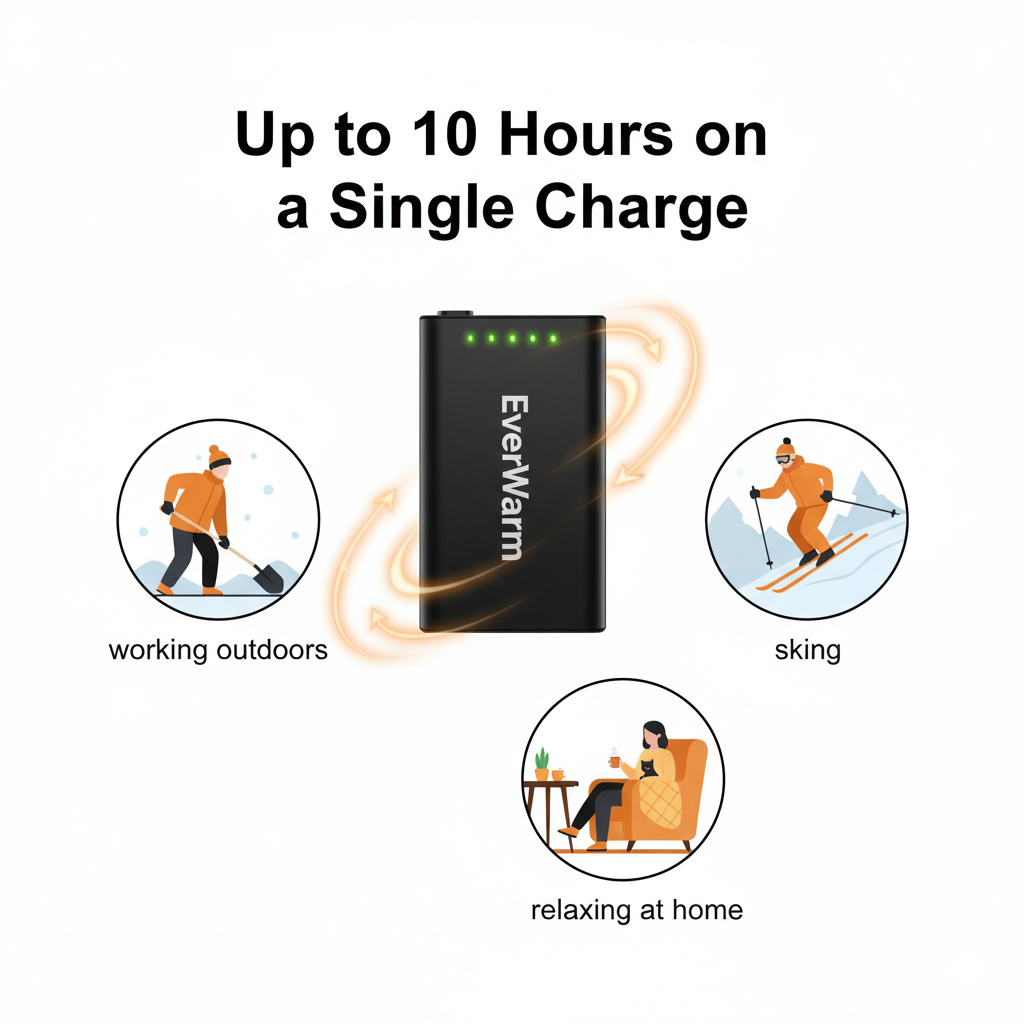 A: EverWarm socks provide up to 10 hours of continuous heat on the lowest setting. Higher settings deliver more intense warmth for shorter periods (around 6–8 hours).